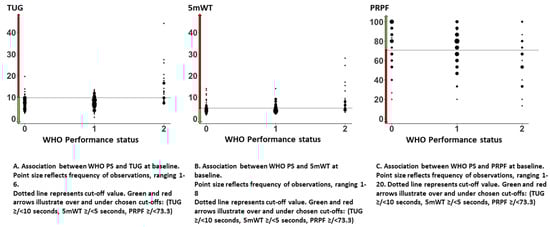 The fact that PRPF was an independent prognostic factor is consistent with previous studies [,], and it might be that PRPF better reflects changes in physical function or how the physical function is compared with the patients’ former or habitual daily function. Consequently, it may be more sensitive to disease-specific changes and, thus, holds more prognostic information than TUG and 5 mWT. Interestingly, many patients with good physical function according to TUG or 5 mWT reported a poor PRPF, indicating that PRPF includes other aspects than TUG and 5 mWT. Patients with a poor WHO PS were more likely to report a poor PRPF, but the prognostic information from PRPF was independent of WHO PS in multivariable analyses.
