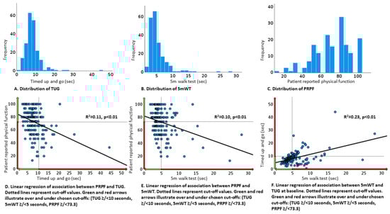 A worse TUG and 5 mWT was significantly associated with lower PRPF, but variation in physical tests only partly explained the variation in PRPF (TUG versus PRPF: R2 = 0.11, p < 0.01; 5 mWT versus PRPF: R2 = 0.10, p < 0.01). The association between TUG and 5 mWT was stronger (R2 = 0.23, p < 0.01) (Figure 3D–F). Several patients with good physical function according to TUG or 5 mWT reported a low PRPF (Figure 3D,E).