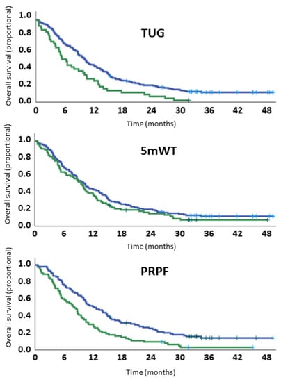 Overall survival (OS) was estimated using the Kaplan–Meier method and compared using the Cox proportional hazard method in uni- and multivariable models. Logistic regression was used for uni- and multivariable analyses of the associations between TUG, 5 mWT, or PRPF and disease control.