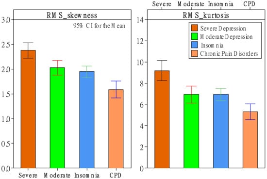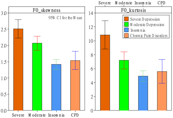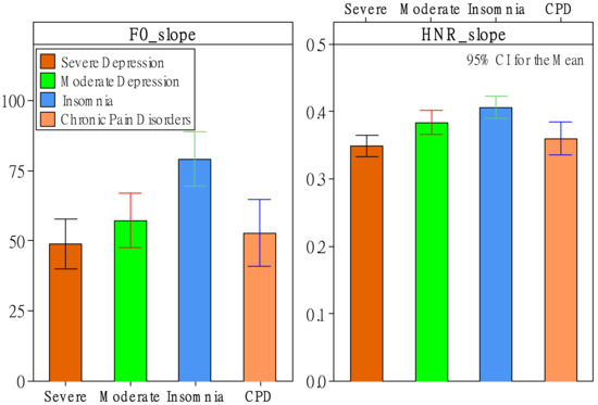 Surprisingly, regarding RMS, ZCR, F0, and HNR features, there were no significant status effects on any mean- or range-related features. As shown in Table 4, previous studies reported that compared to other emotions (e.g., anger, happiness, and fear), sadness results in lesser values of RMS-mean [43,44], RMS-range [43], F0-mean [43], F0 range [43], and resonant voice quality (i.e., high HNR-mean) [44]. However, this study did not find significant effects regarding these phenomena. The main reason could be due to different comparisons. Except for Kiss and Vicsi [45], who compared depression with healthy patients, previous studies compared sadness with other distinguishable emotions, such as anger, happiness, and fear. However, the four groups of patients had relatively fewer emotional differences in this study. Nevertheless, this study found statistical properties other than mean and range in d features that can help discriminate depression patients from insomnia patients and patients with CPD. Our findings show that depression groups had greater RMS-skewness, RMS-kurtosis, F0-skewness, and F0-kurtosis values. RMS-skewness and RMS-kurtosis features discriminated between groups of severe depression and CPD and discriminated these two groups from the other two groups (see Figure 1 and Table 4). Moreover, F0-skewness and F0-kurtosis features discriminated between severe- and moderate-depression patients and discriminated these two groups from the other two groups (see Figure 2 and Table 4). Furthermore, this study showed that depression groups had lower slope values of F0 and HNR, helping discriminate severe-depression, moderate-depression, and insomnia groups (see Figure 3 and Table 4). Note that there were no significant differences between the severe-depression patients and CPD patients.