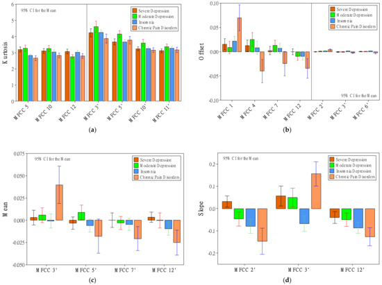 Regarding MFCC features, status had significant effects on 13 d features and 23 d’ features. Kurtosis, again, was an essential feature in showing the differences among the patient groups. There were three significant status effects related to kurtosis found in d features (i.e., MFCCs 5, 10, and 12) and four in d’ features (i.e., MFCCs 3′, 5′, 10′, and 11′). As shown in Figure 4a, as far d features are concerned, there was a trend in that depression patients had greater kurtosis values, especially MFCC 5, compared to groups of insomnia and CPD. Where d’ features are concerned, the moderate-depression group had the greatest kurtosis values among the three groups. Another critical category of features was the offset of the regression coefficient. There were four significant status effects related to offset found in d features (i.e., MFCCs 1, 4, 7, and 12) and three in d’ features (i.e., MFCCs 2′, 3′, and 6′). As shown in Figure 4b, the CPD group had significant differences from the other three groups. The group had the greatest offset values of MFCC 1 and MFCC 2′, and had the lowest offset values of MFCCs 4, 7, 12, 3′, and 6′. Worth noting is that mean and slope features showed the patient differences only in d’ features, not d features. There were four significant relationships of mean features (MFCCs 3′, 5′, 7′, and 12), and three significant relationships of slope features (MFCCs 2′, 3′, and 12′). Regarding the mean features, as shown in Figure 4c, again, the CPD group had significant differences from the other three groups. It had the greatest mean value of MFCC 3′ and had the lowest mean values of MFCCs 5′, 7′, and 12′ in d’ features. Regarding the slope features, as shown in Figure 4d, there was a trend in that depression patients had greater slope values of MFCCs 2′ and 12′ compared to the groups of insomnia and CPD. Again, the CPD group had significant differences from the other three groups. It had the greatest slope value of MFCC 3′ and the lowest slope values of MFCCs 2′ and 12′.