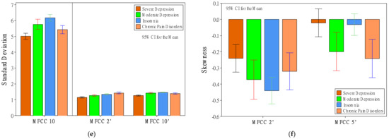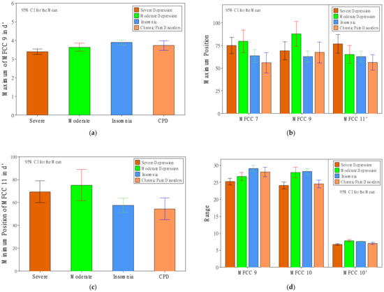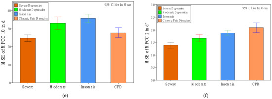 Other voice features that showed relatively less significant relationships (between one and two for either d or d’ features) were SD, skewness, maximum value, maximum position, minimum position, range, and MSE. Regarding the SD features, as shown in Figure 4e, the severe-depression group had the lowest SD value of MFCC 10 and had the lowest SD values of MFCCs 2′ and 10′ in d’ features. The SD value of MFCC 2′ showed an ideal trend in that SD values were significantly different among the four groups. The values increased from severe to moderate, insomnia, and then CPD. Regarding the skewness features, as shown in Figure 4f, the severe-depression group had the greatest skewness value of MFCC 2′. Regarding the maximum-value features, as shown in Figure 5a, the severe-depression group had the lowest maximum value of MFCC 9′. Regarding the maximum-position features, as shown in Figure 5b, there was a trend in that depression patients had greater maximum-position values, especially MFCC 7, compared to groups of insomnia and CPD. The moderate-depression group had the greatest maximum-position value of MFCC 9. The severe-depression group had the greatest maximum-position value of MFCC 11′. Regarding the minimum-position features, as shown in Figure 5c, again, depression patients had greater minimum-position values of MFCC 11′ compared to groups of insomnia and CPD. Regarding the range features, as shown in Figure 5d, the severe-depression group had the lowest range values of MFCCs 9, 10, and 10′. Regarding the MSE features, as shown in Figure 5e, the severe-depression group had the MSE range values of MFCC 10′. However, the MSE value of MFCC 2′, as shown in Figure 5f, showed an ideal trend in that MSE values were significantly different among the four groups. The values increased from severe to moderate, insomnia, and then CPD.