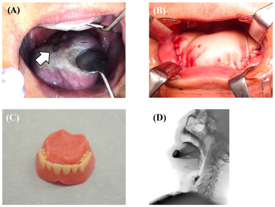 A case of tongue squamous cell carcinoma (T4aN3bM0, Stage IVB) treated with a tracheotomy, tumor resection, modified radical neck dissection (Type III), and pectoralis major musculocutaneous flap reconstruction; the patient recovered to be able to eat with palatal augmentation prosthesis. After completing chemoradiotherapy, the patient takes almost all of their nutrition orally and does well, with no recurrence or metastasis. (A) Mirror view of the primary tumor on the dorsum of the tongue. (B) Intraoperative photo of tongue reconstruction by pectoralis major musculocutaneous flap. (C) Palatal augmentation prosthesis. (D) Findings of videofluoroscopic examination of swallowing where the patient was able to swallow jelly with palatal augmentation prosthesis.