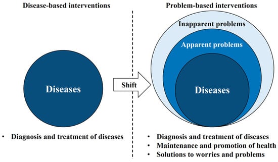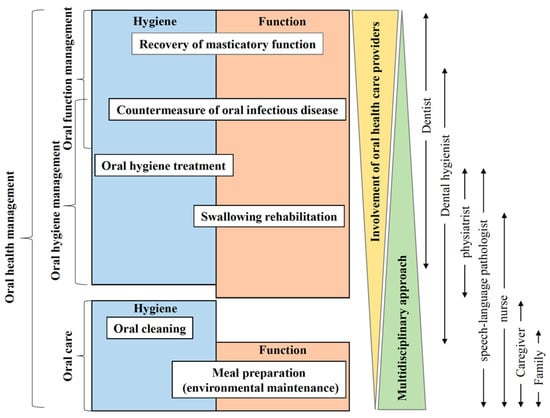 Oral health management is defined as interventions for comprehensive oral-related factors (Figure 2). According to a review by Wong et al., systemic condition (body mass index, cognitive function, and comorbidities), oral health status (presence of dental caries and periodontal disease), general oral problems (mucosal, dental, periodontal, and temporomandibular joint problems, denture problems, masticatory function, and functional tooth units), oral health-related quality of life (QoL), non-modifiable factors (age, sex, race, and educational level), and modifiable factors (dental service attendance and service accessibility, dependent individuals, medications, health insurance, and income) have been identified as related factors [16,17]. In other words, oral health management is a paradigm shift for dental practitioners because it requires a shift from a disease-based approach to a problem-based approach (Figure 3). Therefore, based on human needs, the conceptual model is used in the dental hygiene process as an indicator of concepts, including oral hygiene management and oral function management, to identify how patient problems may guide intervention [18].