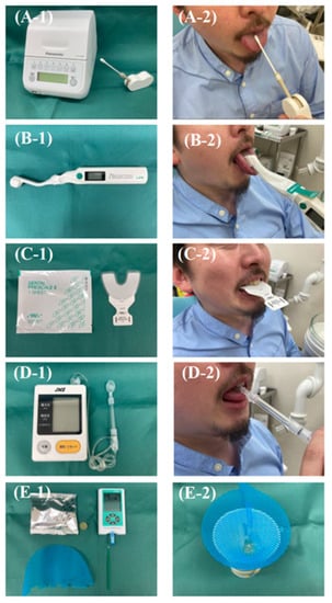 Testing instruments for oral function assessment and their use. (A-1) Bacterial counter. (A-2) Specimen being collected from the dorsum of the tongue. (B-1) Oral moisture checker. (B-2) Measuring oral moisture on the dorsal surface of the tongue. (C-1) Dental prescale. (C-2) Measurement of occlusal force using dental prescale. (D-1) JMS tongue pressure measuring instrument. (D-2) Measurement of tongue pressure using a probe. (E-1) Gluco Sensor GS-II. (E-2) After chewing and filtering gummy jelly.