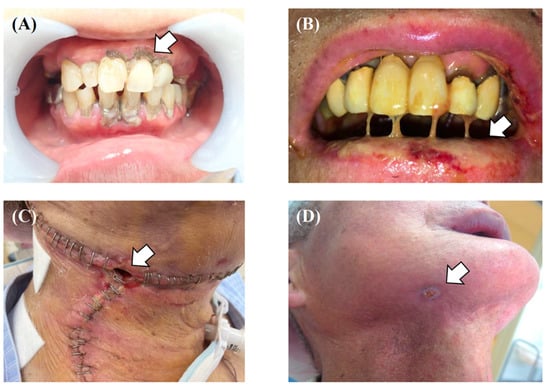 Osteoradionecrosis of the jaw (ORNJ), caused by the radiation field entering the oral cavity, tends to develop close to the primary tumor site and is likely triggered by surgical procedures such as tooth extraction, within 6 months of the irradiation (Figure 5D) [77,78]. Gender, dentition, and chemotherapy do not affect the development of ORNJ; a paper that analyzed risk factors for the development of ORNJ in 776 head and neck cancer patients that received intensity-modulated radiation therapy (IMRT), identified the location of the tumor in the oral cavity, radical radiation therapy or not, and previous surgical treatment of the maxilla and mandible as risk factors [79,80]. However, in a case-control study of risk factors for the development of ORNJ in head and neck cancer patients, the use of chlorhexidine mouthwash (1.28-fold) and scaling within 2 weeks before radiotherapy (2.43-fold) were reported as risk factors for the development of ORNJ. Therefore, careful prescription of mouthwash and appropriate timing of scaling should be considered [81].