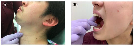 Functional swallowing exercises for oral cancer patients. (A) Performing the Mendelssohn maneuver. (B) Manual opening training.
