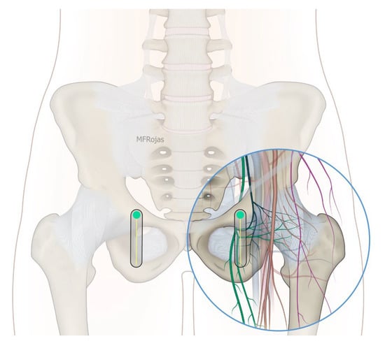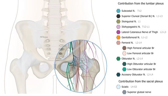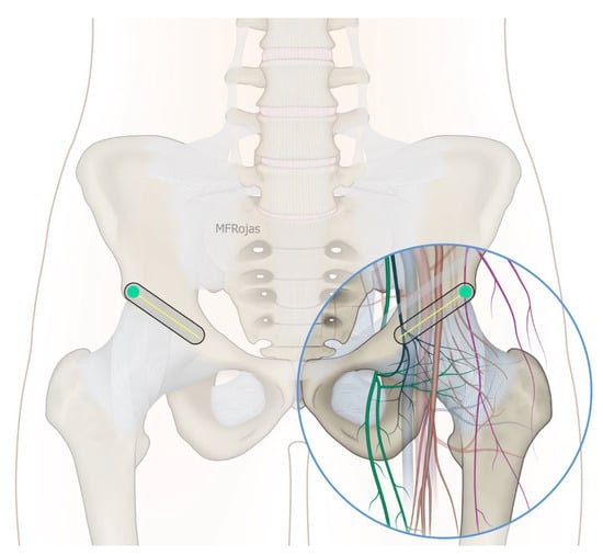 - Nagpal, A.S.; Brennick, C.; Occhialini, A.P.; Leet, J.G.; Clark, T.S.; Rahimi, O.B.; Hulk, K.; Bickelhaupt, B.; Eckmann, M.S. Innervation of the posterior hip capsule: A cadaver study. Pain Med. 2021, 22, 1072–1079. [Google Scholar] [CrossRef]