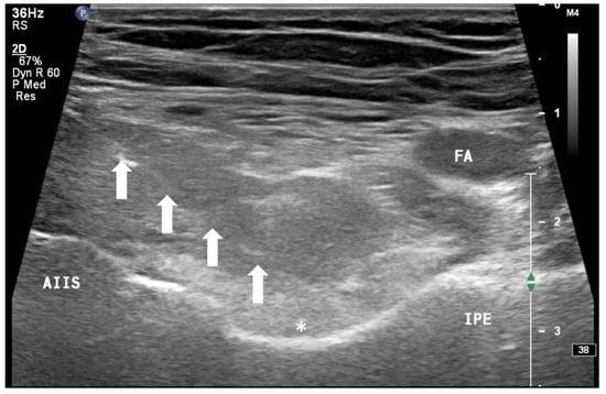 Ultrasound image showing injection of FNAB and AON by infiltration of the drug between the IPE and AIIS from lateral to medial (PENG approach). FA: femoral artery, AIIS: anterior inferior iliac spine, IPE: iliopectineal eminence, *: absolute alcohol spreading underneath iliopsoas muscle above the ASIS-IPE bone surface, white arrow: needle.