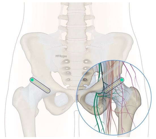 - Short, A.J.; Barnett, J.J.G.; Gofeld, M.; Baig, E.; Lam, K.; Agur, A.M.; Peng, P.W. Anatomic study of innervation of the anterior hip capsule: Implication for image-guided intervention. Reg. Anesth. Pain Med. 2018, 43, 186–192. [Google Scholar] [CrossRef]