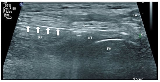 Ultrasound image showing the iliopsoas plane infiltration. FA: femoral artery, FH: femoral head, IP: iliopsoas, RF: rectus femoris, IFL: iliofemoral ligament; white arrow: needle.