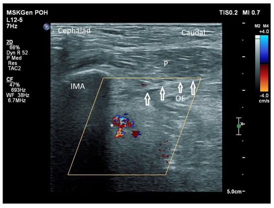Approaching the ONAB in a sagittal plane from a caudal to cephalic direction. IMA: inferomedial acetabulum, P: pectineus, OE: obturator externus, *: acetabular and/or posterior branch of the obturator artery, white hollow arrow: needle.