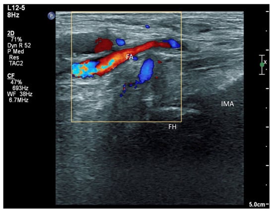 Doppler signal of the femoral artery and its branches when scanning the inferomedial acetabulum by the classical oblique approach. FH: femoral head, FA: femoral artery and branches, IMA: inferomedial acetabulum.
