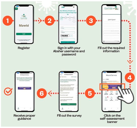 Mawid is a mobile application provided by the Ministry of Health to enable patients to book, cancel and/or reschedule their appointments at primary healthcare centers, as well as manage their referral appointments [26]. It helps the users to assess the risk of COVID-19 contamination. Users are advised to enter symptoms and their travel details into the application for the risk assessment test. It also helps users in increasing awareness about COVID-19, and the precautionary measures to be taken, in addition to booking, cancelling and/or rescheduling appointments [25,27]. The assessment process using the application is presented in Figure 1.