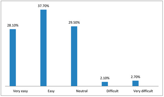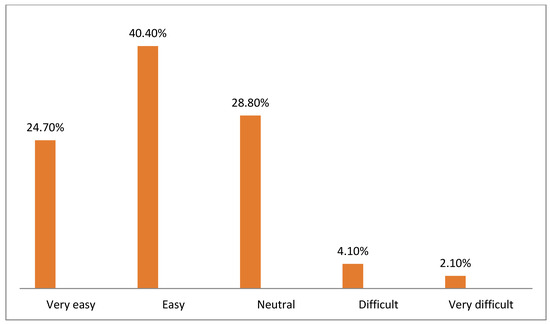 Figure 2, Figure 3, Figure 4, Figure 5, Figure 6 and Figure 7 illustrates the opinion of the respondents (very easy, easy, neutral, difficult, or very difficult) related to the ease of use of the Mawid application (ease of logging into the application, clarity of the data and its arrangement within the program, ease of searching for the required information, ease to reserve an appointment, ease to undo an unwanted move, and ease to change an appointment).