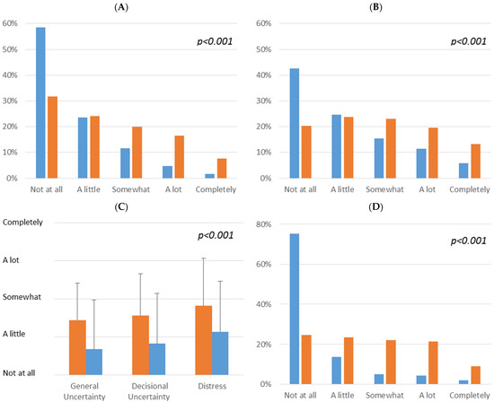 Perception of (A) decisional uncertainty and (B) distress due to uncertainty in oncology (blue) and psychiatry (orange) patients; (C) mean ± SD for general, treatment-related decisional uncertainty and resulting distress during own treatment decisions; (D) required treatment modification due to pandemic conditions from patients’ perspectives (Percentage histograms of all respondents).