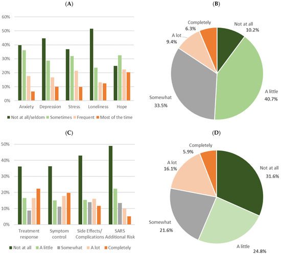 (A) Perception of anxiety, depression, stress, loneliness and hope within two weeks before questionnaire; (B) reflection of own pandemic risk during data-capture period; (C) modification requirement for treatment and patients’ criteria for treatment decisions; (D) burden due to additional risk for treatment by COVID-19 (Percentages of all respondents).