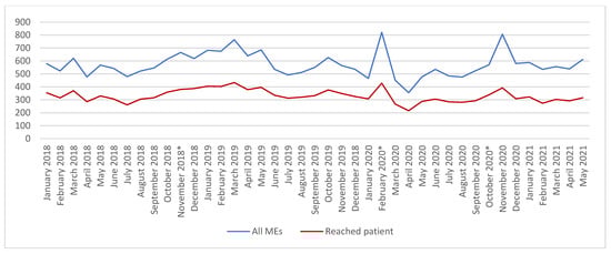 Trends in all reported MEs and MEs which reached patients during 1/2018–5/2021. * Different implantation phases (Go-Lives = GLs) GL1: 11/2018, GL2.1: 2/2020 and G 2.2. 10/2020.