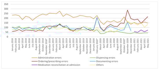 Trends in the medication error subtypes during 1/2018–5/2021. * Different implantation phases (Go-lives = GLs) GL1: 11/2018, GL2.1: 2/2020 and GL2.2. 10/2020. Others: Preparing and compounding, ordering drugs from the pharmacy, delivering drugs from the pharmacy, storage errors, unexpected reactions in a patient, not known, and monitoring errors (new type added in 2021). The medication reconciliation at admission error subtype was added, and documenting of the error subtype was removed from the HaiPro system at the beginning of 2021.