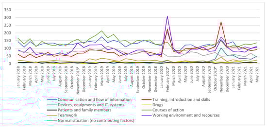 Trends in the reporter contributing factors related to MEs during 1/2018–5/2021. * Different implantation phases (Go-lives = GLs) GL1: 11/2018, GL 2.1: 2/2020 and GL 2.2. 10/2020. Contributing factors that were not included in the figure include organisation and management (only 0–5 reports per month) and not known contributing factors.