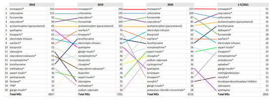 TOP20 medications related to the reported MEs in 2018–2020. * High-alert medication [7].