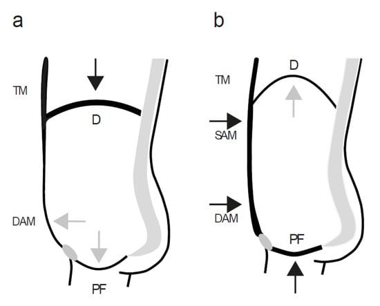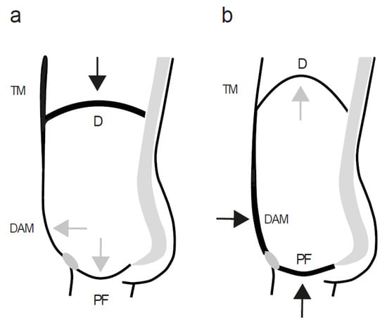 A schematic representation of a mid-sagittal view through the abdominal cavity to demonstrate the opposite orientation and contractile muscle state but parallel downward (a)/upward (b) movement of the thoracic and pelvic diaphragm where the body cavities widen and narrow during quiet breathing at rest. D = thoracic diaphragm, PF = pelvic floor, DAM = deep anterolateral abdominal muscles, TM = thoracic muscles. The thicker lines indicate a muscle contraction and the thinner lines indicate a muscle relaxation. The black arrows indicate an active force vector and the grey arrows indicate a passive force transmission.