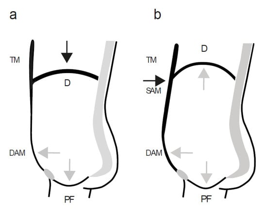 A schematic representation of a mid-sagittal view through the abdominal cavity to demonstrate the movements and contractile state of the muscle groups surrounding the abdominal cavity during (a) inspiration and (b) physical strain with a “correct” contraction of the PFMs and the anterolateral abdominal muscles during the exhaling of air through an open glottis. D = thoracic diaphragm, PF = pelvic floor, DAM = deep anterolateral abdominal muscles, SAM = superficial anterolateral abdominal muscles, TM = thoracic muscles. The thicker lines indicate a muscle contraction and the thinner lines indicate a muscle relaxation. The black arrows indicate an active force vector and the grey arrows indicate a passive force transmission.