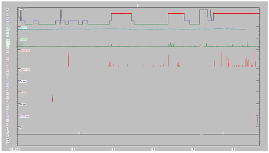 The patient underwent a type I full polysomnography according to American Academy Sleep Medicine (AASM) guidelines to rule out sleep apnea and snoring. RBD episodes have been recorded by Video-PSG in all three REM periods. The variety of the movements went from simple brisk movements/jerks to elaborated movements; in fact, the patient, who is an officer of the Hellenic Navy, used to also be a football (soccer) referee. Therefore, in the most elaborated RBD episode, the patient showed clearly that he was trying to take a yellow/red card out of his pocket in order to penalize a football player (the patient recalled the dream after awakening). As the patient had heavy professional duties (officer in the Hellenic Navy and at the same time an MSci student), he was severely sleep-deprived; all the above-mentioned clues may explain the gross amount of N3/REM sleep (partly due to rebound) and the absence of sleep fragmentation/sleep stage shift. The PSG showed an apnea–hypopnea index of 0.5/h, without periodic leg movements (PLMs) (Figure 1, Table 1). The snore index was 3.2% of the total sleeping duration. Therefore, we concluded that his symptoms were not related to sleep apnea.