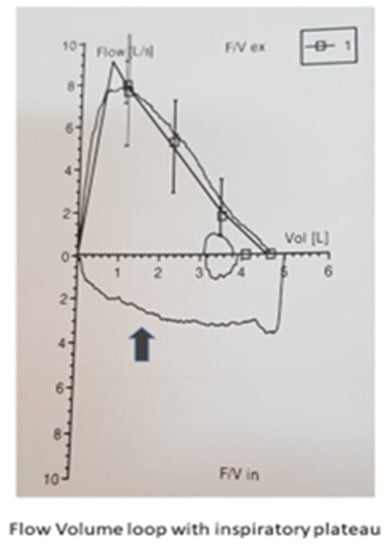 Spirometry was performed, and the flow–volume loop yielded a reduced inspiratory flow during forced inspiration, with a normal expiratory flow pattern (“inspiratory plateau”, Figure 2), indicating a variable extrathoracic airway obstruction. The upper and lower respiratory system computed tomography did not show any anomalies or mechanical lesions (e.g., masses and scars). Fiberoptic laryngoscopy revealed partially abnormal activity of laryngeal muscles during quiet breathing and inspiration, leading to a partial obstruction. The combination of the three symptoms (RBD, nocturnal enuresis, and stridor) and a positive dopamine transporter (DaT) scan was diagnostic for multiple system atrophy (MSA). A DaT scan is a tool used to confirm the diagnosis of Parkinson’s disease. It is a specific type of single-photon emission computed tomography (SPECT) imaging technique that helps visualize dopamine transporter levels in the brain. Levodopa + benserazide hydrochloride tb (200 + 50) mg was introduced at the initial dosage of 50 + 12.5 mg three times/day mostly for slight left arm tremor and bradykinesia. After several months, the dosage was increased to 100 + 25 mg three times/day, with better results. We also prescribed auto-positive airway pressure (APAP, 8–12 cm H2O) for symptomatic control of stridor and levodopa.