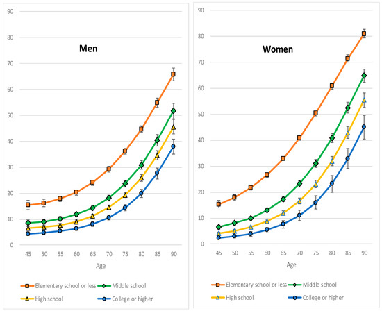 Kim, R.; Chung, W. Effect of Aging on Educational Differences in the Risk of Cognitive Impairment: A Gender-Specific Analysis Using Korean Longitudinal Study of Aging (2006–2016). Healthcare 2022, 10, 1062. https://doi.org/10.3390/healthcare10061062