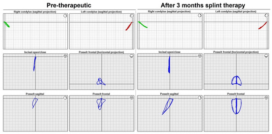 Function report pre- and post-treatment. Indication of right and left condyle in sagittal projection, incisal open/close movements in frontal projection, and Posselt diagram in horizontal, sagittal, and frontal projection before (left) and after (right) treatment.
