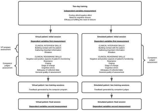 We applied two teaching methods to investigate a wide range of diagnostic competencies. One involved direct contact, while the other was computer mediated; this enabled the measurement of dependent variables at two levels of interaction. The first method—simulated patient (SP)—demands significant involvement, since the learner has to perform a complex diagnostic activity, bridge cognitive biases, formulate diagnostic interventions and more [,]. The second—virtual patient (VP)—entails a lower cognitive–emotional burden because the student does not have direct contact with the patient. At the same time, they can be provided with information on the steps they have to take [].