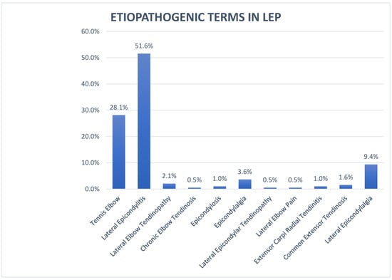 In the literature, to date, the terminological framework of this problem is confusing. Indeed, researchers adopted more than 10 names (i.e., lateral elbow tendinopathy, lateral epicondylitis, tennis elbow, lateral epicondylalgia, lateral epicondylosis) to define LEP [,,].