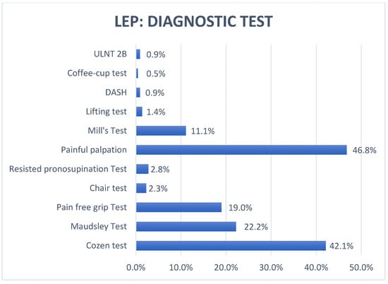 In this SR, eight different provocation tests were identified (painful palpation, Cozen test, Maudsley test, chair test, resisted pronosupination test, Mill’s test, lifting test, coffee-cup test): Painful palpation of the epicondyle (46.8%), the Cozen test (42.1%), and the Maudsley test (22.2%) were the most mentioned ones in the 216 selected RCTs.