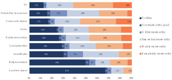 Reliability of COVID-19 information sources. (Five scales: lowest trust (darkest color) to highest trust (lightest color) (n = 453).