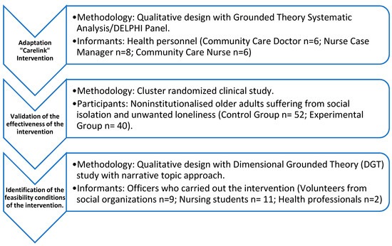 As the literature [13] shows, multiple strategies have been followed to develop intervention projects in the field of unwanted social isolation and loneliness in older adults. However, the available evidence [7,8,9,10,11,12,13] highlights several associated features with increased effectiveness. In this sense, the main features are (a) interventions with theoretical underpinning and methodological soundness vs. those without; (b) multi-methodological interventions vs. those with a single methodology; (c) interventions based on participatory designs vs. those based on expert knowledge only; (d) interventions with process evaluation vs. those with only an outcome evaluation; (e) interventions with specific training and prior training of intervention agents vs. those based on generalist knowledge; (f) interventions with an educational component, group-based, and a particular target population vs. those that do not involve behavioral changes, of an individual or generalist nature; (g) interventions that seek synergies with community resources vs. those that make use of hyper-specialized resources; and (h) interventions based on personalized itineraries vs. those based on standardized interventions.
