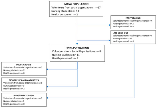 The following participated in the project as intervention agents: 17 volunteers from social organizations (8 of whom dropped out), 13 nursing students (2 of whom dropped out), and 2 health professionals (Figure 2). In the case of the volunteers belonging to social organizations who dropped out, they did so early (after having completed the initial training and having had the first encounter with the assigned older adult in the study) and for reasons unrelated to the intervention.