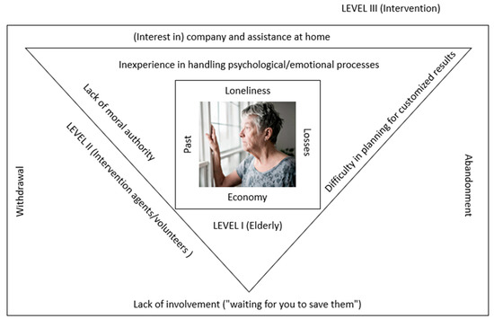 The findings obtained from the participants’ discourses can be grouped around the following three themes: (a) the elderly between the walls of loneliness, economic difficulties, losses, and the past; (b) intervention agents/volunteers between the walls of inexperience in the management of psychological/emotional processes, lack of moral authority, and difficulty in planning results adapted to the (elderly) person; and (c) intervention between the walls of (interest in) company and assistance at home, lack of involvement (“waiting for you to save them”), and withdrawal/“abandonment”.