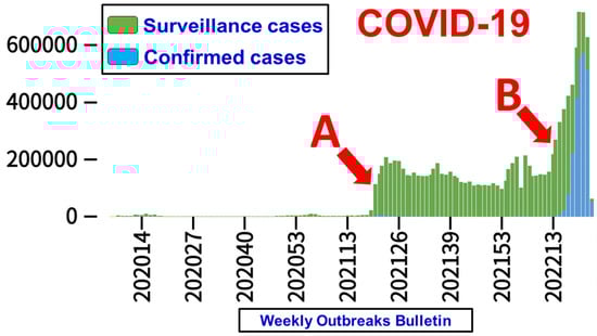 Surveillance data of COVID-19 in Taiwan. Two un-expected hits of this disease in Taiwan were noticed. (Time point A) The first hit occurred in May 2021 and was caused by the Alpha variant. There were 37,710 confirmed cases and 854 deaths; (Time point B) the second hit started in April 2022 caused by the Omicron variant (Data modified from the press release by the Taiwan Centers for Disease Control, https://www.cdc.gov.tw/En; accessed on 6 June 2022).