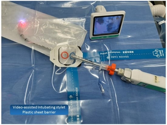 Under the airway consensus and guidelines, video-laryngoscopy is recommended as the first-choice tracheal intubation tool during the COVID-19 pandemic [1,2,3]. Meanwhile, personal protective equipment (PPE) is essential and required for airway managers (operators) who care for the COVID-19 patients [4,5]. Initially a variety of improvised devices were designed to protect the airway managers from contaminations, such as the aerosol box, which was designed as a barrier enclosure for tracheal intubators [6]. Unfortunately, it was quickly shown that such boxes were potentially more harmful to both patients and the medical staff [7,8]. We proposed applying a piece of clear plastic sheet as a drape along with a video-assisted intubating stylet for tracheal intubation to protect the intubator from exposure to the aerosol and/or secretions during intubation (Figure 2 and Figure 3) [9,10,11,12]. The clear and soft plastic sheet adds an additional layer of protection against the possible splash of secretion/mucus, without interference or hindering of the intubation procedure [13]. In this report, we share our own clinical experience of applying the Shikani video-assisted intubating stylet technique [14,15,16,17] with a plastic sheet that acts as an ancillary barrier in patients during the Omicron pandemic in Taiwan (Figure 1, time point B).