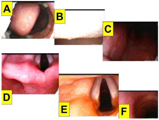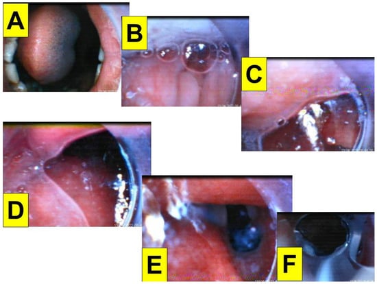 Various views displayed at the video monitor of the intubating stylet through a piece of plastic sheet barrier. (A) Entry of oral cavity; (B) partial view of tongue and oral space; (C,D) pharyngeal space and epiglottis; (E) glottic view with open vocal cords; (F) intra-tracheal space. The time for intubation (from lip to trachea) is 10 s. Copious saliva and bubbles, crowded pharyngeal space, and posteriorly displaced and relaxed epiglottis were noticed (see also the video clip in the Supplementary Materials Video S2).