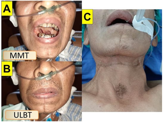 A patient was scheduled to receive video-assisted thoracic surgery (VATS) due to pulmonary empyema. He had prior history of tongue cancer and had received surgical resection, radiation therapy and chemotherapy. (A) Mouth-opening was about 3 cm with a grade 3 modified Mallampati test; (B) upper lip bite test, grade 3; (C) the head and neck displayed surgical scars, radiation fibrosis, and tracheostomy scar. MMT: Modified Mallampati Test. ULBT: Upper lip bite test.