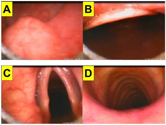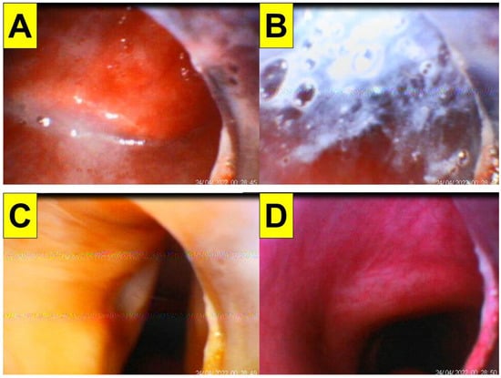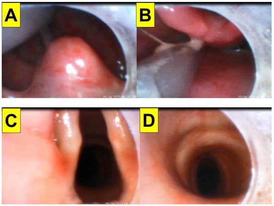 Tracheal intubation using the Shikani technique and plastic sheet barrier in a COVID-19 confirmed case for an emergency surgery. (A) Posteriorly displaced epiglottis; (B) obscured view by copious mucus; (C) full glottic view; (D) smooth insertion into tracheal lumen. The time for intubation (from lip to trachea) is 12 s (see also the video clip in the Supplementary Materials Video S5).