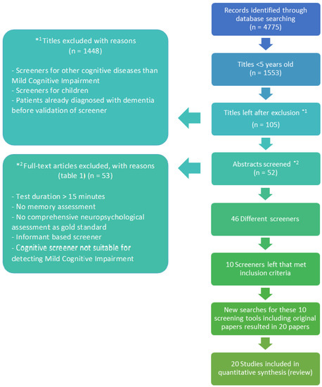 After the systematic search and identification of 10 suitable screeners, we performed a snowball search to obtain further literature about these 10 screeners. For this snowball search, we searched the aforementioned databases for every screener separately. In addition, we aimed to trace the original article about the development and validation of the screener. From there on, we searched the reference list for relevant articles providing more information about the diagnostic properties of the screener. The aforementioned inclusion and exclusion criteria were applicable to this snowball search. For the snowball search, there was no predefined period chosen, as we wanted to include original articles. In the end, although we started with the identification of papers published between 2015 and 2020, articles published before 2015 could also be included in this review. Unless described otherwise, MCI was diagnosed according to Petersen’s criteria [18].