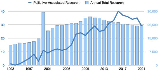 Changes in the number of palliative-associated studies to annual total studies from 1993 to 2021.