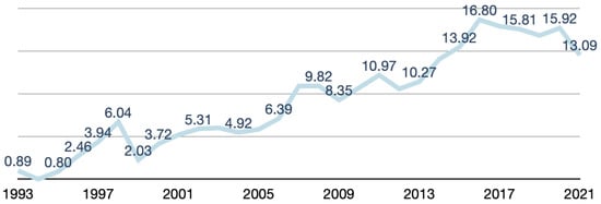 Changes in the ratio of palliative-associated research to annual total research in Taiwan from 1993 to 2021 (presented by basis point).