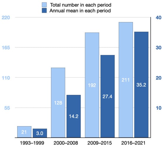 3.2. Changes in the Number of Palliative-Associated Studies and Annual Mean in Different Periods