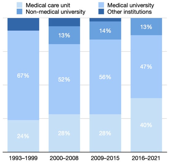 The number of studies conducted in medical universities accounted for 67% of all studies in period 1, which gradually decreased to 52%, 56%, and 47% in periods 2, 3, and 4, respectively.