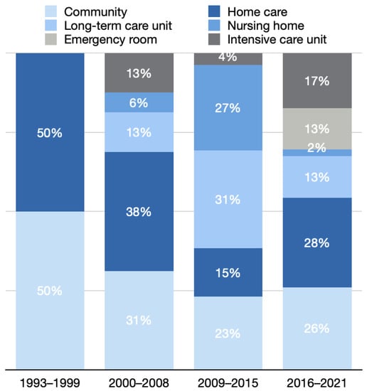 In period 4, 28% of the studies with out-of-hospital settings took home care as a field of investigation; 26% took the community; 17% took intensive care units; 13% took long-term care and emergency rooms; and 2% took nursing homes as a field of investigation (Figure 6).