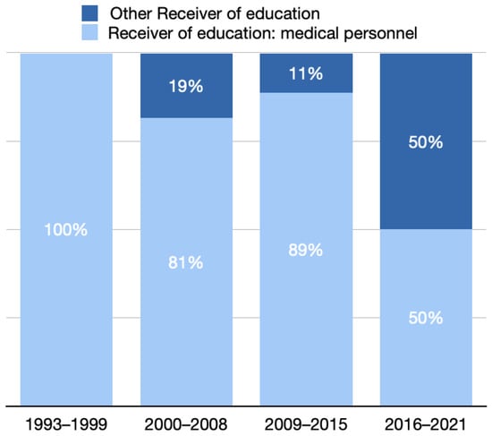 The number of studies whose receivers of education were healthcare professionals decreased to 81% and 89% in periods 2 and 3 and markedly decreased to 50% in period 4 (Figure 7).